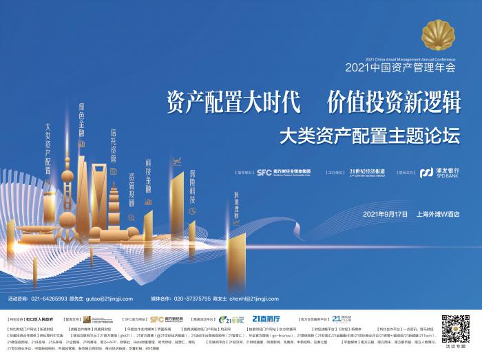 在这样的背景下,2021年9月17日,由《21世纪经济报道》主办,上海浦东发展银行联合主办的2021中国资产管理年会,将举办以“资产配置大时代 价值投资新逻辑”为主题的分享论坛。论坛将邀请经济宏观分析专家、国内外领先资产管理机构的投资负责人以及商业银行资管部门负责人,一起探讨大类资产配置的方向和策略,讨论年初原材料等产品价格出现大幅上涨引发的通胀问题,以及货币政策是否转向,市场利率如何变化,各类资产将出现怎样的走势等等。