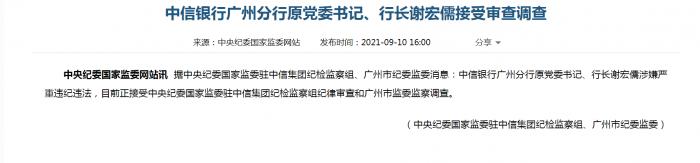 21世纪经济报道记者 叶麦穗 广州报道 中央纪委国家监委网站消息,据中央纪委国家监委驻中信集团纪检监察组、广州市纪委监委消息:中信银行广州分行原党委书记、行长谢宏儒涉嫌严重违纪违法,目前正接受中央纪委国家监委驻中信集团纪检监察组纪律审查和广州市监委监察调查。