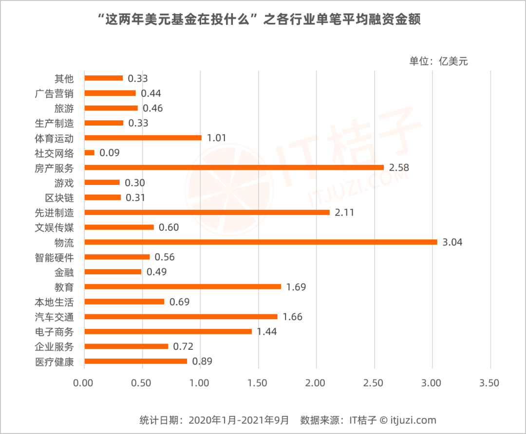 此外,单笔平均最高的还有教育、汽车交通等,都超过了整体 1.2 亿美元的平均线。