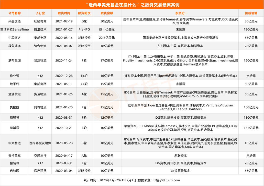 IT 桔子记录到 15 起单笔超过 10 亿美元的融资交易,其中最高单笔达到了 30 亿美元——社区团购公司兴盛优选在今年初拿到了惊人的 30 亿美元融资——要知道这两年募资总规模超过 30 亿美元的基金都不超过 5 只。
