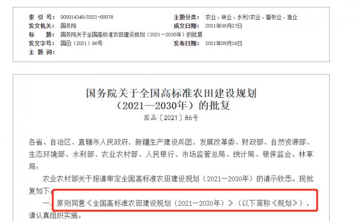 农业农村部关于报请审定全国高标准农田建设规划(2021—2030年)的请示收悉。现批复如下: