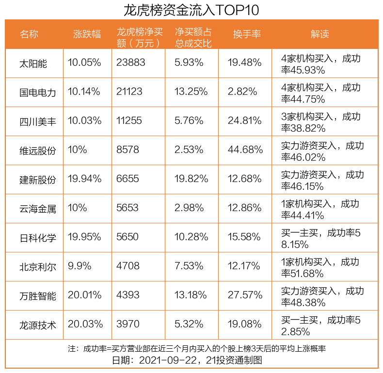 9月22日,上证指数上涨0.4%,深证成指下跌0.57%,创业板指下跌0.91%。盘后龙虎榜数据显示,共有39只个股因当日异动登上龙虎榜,资金净流入最多的是太阳能(000591.SZ),达2.39亿元。