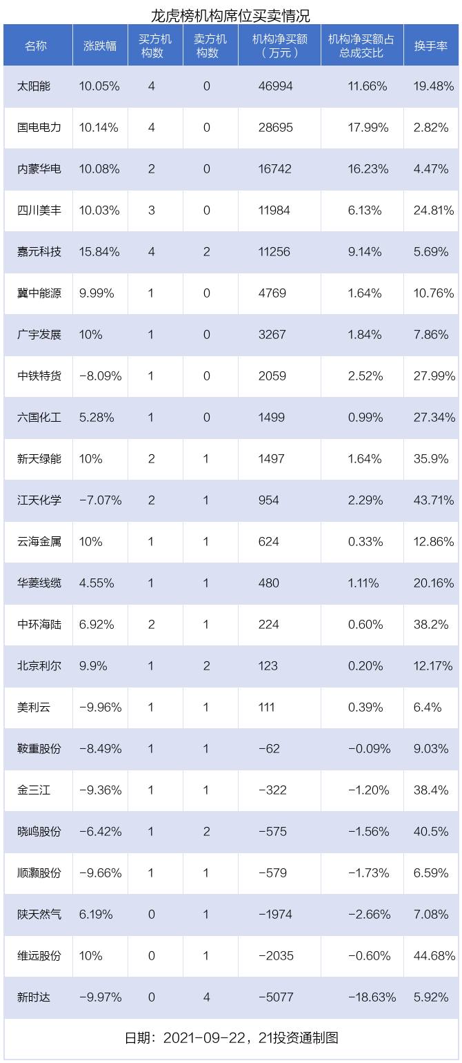 其中,机构净买入金额最多的是太阳能(000591.SZ),当日收盘上涨10.05%,换手率为19.48%。