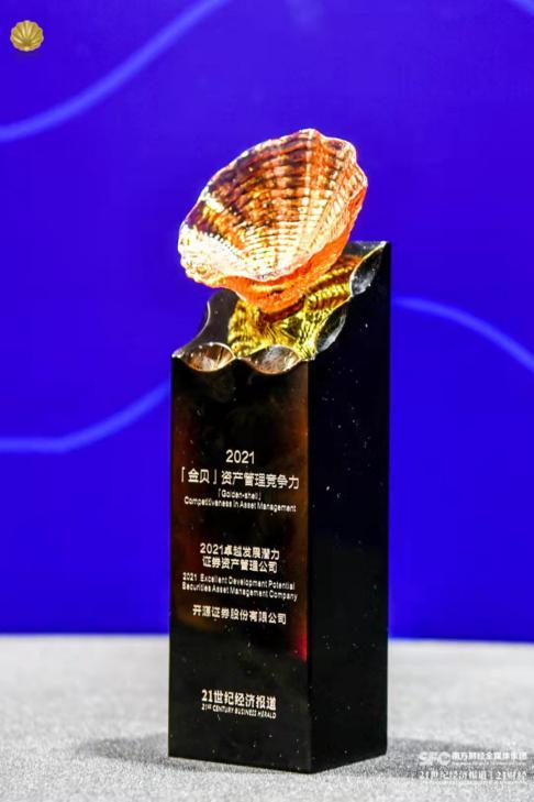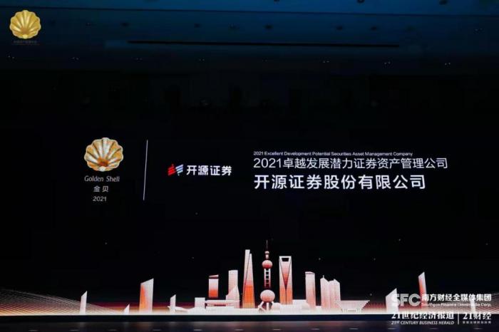 9月17日,由《21世纪经济报道》主办的2021中国资产管理年会暨十四届“金贝奖”资产管理竞争力研究盛典在上海外滩举办,会上揭晓了中国资产管理“金贝奖”评选结果,开源证券股份有限公司(下称“开源证券”)凭借优秀的资产管理能力和专业的资管团队打造,摘得“2021卓越发展潜力证券资产管理公司”称号。