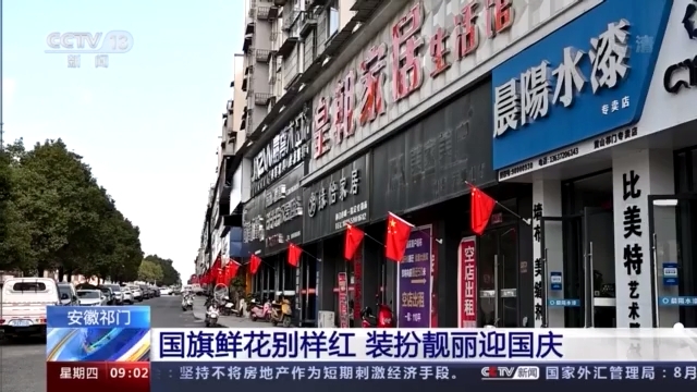 在安徽祁门县,城区道路两旁的路灯上,悬挂起了五星红旗,不少商户也自发地在自家门口挂起了国旗。此外,在祁门县多个十字路口,红色的鸡冠花、黄色的万寿菊等各种造型各异的花儿错落有致,绚丽多彩,让人赏心悦目。