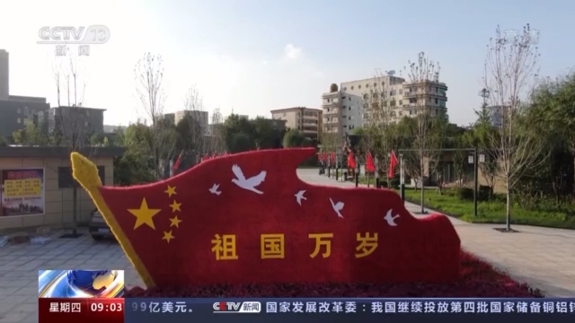 在河南商丘,园林绿化工作人员用12000多盆彩叶草等花卉,拼成巨大的“72 庆祝国庆”字样景观造型。主题造型与各色鲜花交相辉映,庆祝新中国成立72周年。在道路两旁,鲜艳的五星红旗迎风飘扬,营造出喜庆祥和的节日氛围。