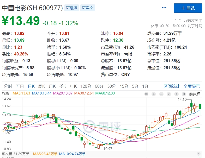 中国电影主推《我和我的父辈》的同时还参与了《长津湖》以及将在11月上映的《铁道英雄》等出品,而8月初以来,中国电影陆续发布公告称,公司参与出品电影《长津湖》、《我和我的父辈》以及国产灾难电影《峰爆》、亲情题材电影《妈妈的神奇小子》《关于我妈的一切》等。从8月初的低点至今,实现累计上涨超20%。