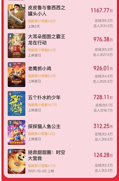 国庆期间,还有6部动画电影“扎堆”上映,争夺亲子观影市场。猫眼研究院《2021暑期档动画电影数据洞察》指出,在双休、档期、学生假期等存在需求的情况下,亲子动画更多的是一种需求消费,而非内容消费。