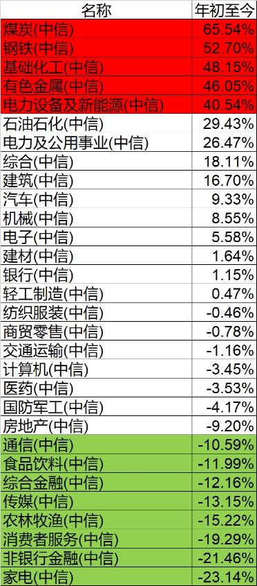 从行业板块来看,因行情分化较大,行业之间表现差异较大。从中信一级行业分类来看,煤炭、钢铁、基础化工、有色金属等涨势如虹,今年以来涨幅分别达到65.54%、52.7%、48.15%、46.05%。此外,电力设备和新能源涨幅超40%,达到40.54%。