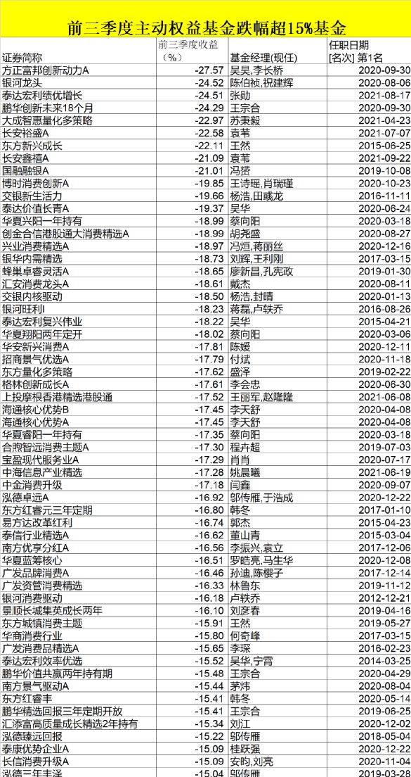 从单只基金看,截至9月30日,合计50多只主动权益基金(各份额合并统计)年内净值跌幅超过15%。