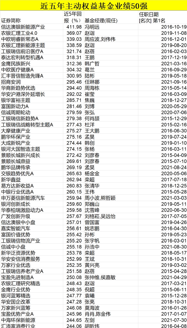 从主动权益基金看,最近5年表现最好的是冯明远管理的信达澳银新能源产业,这五年回报高达411.98%。农银汇理工业4.0、中欧明睿新常态A、农银汇理新能源主题、工银瑞信前沿医疗A、泰达宏利转型机遇A、金鹰民族新兴等也表现较好,位居前列。