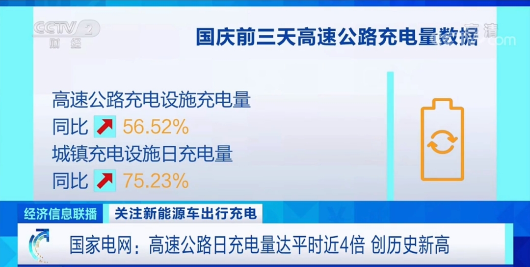 新能源汽车的充电拥挤问题已非个别现象。据央视《经济信息联播》披露,今年10月1日,国内高速公路充电设施充电量达到142.92万千瓦时,接近平时日充电量的4倍,创历史新高。10月1日到3日,国家电网充换电服务网络总充电量同比增长59%,其中高速公路充电设施充电量同比增长56.52%,城镇充电设施日充电量同比增长75.23%。