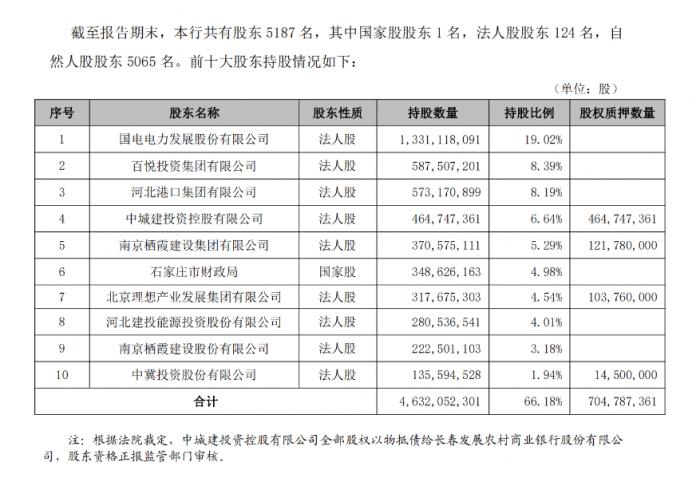 长春发展农商银行所持河北银行股权来自抵债。根据河北银行此前披露信息,根据法院裁定,中城建投资控股有限公司全部股权以物抵债给长春发展农商银行,股东资格正报监管部门审核。长春发展农商银行入股河北银行后,将成为其第五大股东。河北银行第二至第四大股东分别为百悦投资集团及其关联人、南京栖霞建设集团及其关联人、河北港口集团。