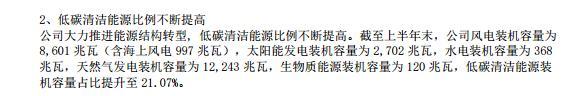 以华能国际举例,作为火电龙头,它正在推进向新能源方向转型。财报显示,今年上半年,华能国际低碳清洁能源装机容量占比提升至21.07%。其中,风电装机容量为8601兆瓦(含海上风电997 兆瓦),太阳能发电装机容量为2702 兆瓦,水电装机容量为368兆瓦,天然气发电装机容量为 12243兆瓦,生物质能源装机容量为 120 兆瓦。