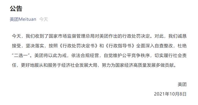 美团发布公告称,我们收到了国家市场监督管理总局对美团作出的行政处罚决定。对此,我们诚恳接受,坚决落实,按照《行政处罚决定书》和《行政指导书》全面深入自查整改,杜绝“二选一”。美团将以此为戒,依法合规经营,自觉维护公平竞争秩序,切实履行社会责任。
