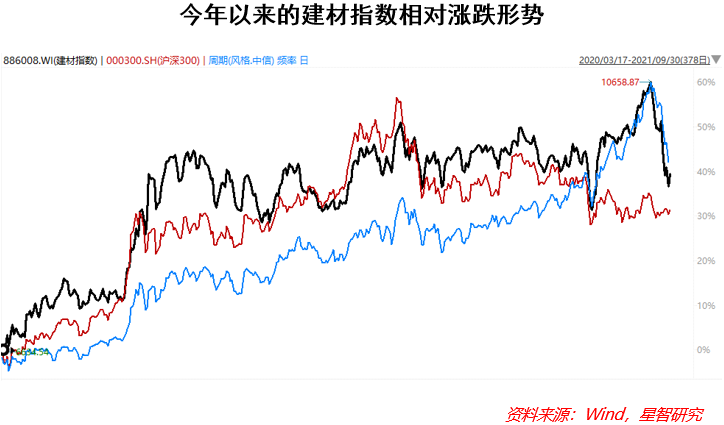总体看,2020年中国经济复苏,房地产持续繁荣,建筑业和建材行业总体回升。今年以来房地产调控趋严,房企融资受限,总体施工面积增速未来承压,基建增速也在回落,但建材行业在供给刚性较大的情况下,上游原材料价格上涨,建材也不例外,价格上涨带动盈利改善预期,建材公司在7月份开始明显上涨。但8月开始、9月席卷全国的限电停产使得建材的逻辑由涨价变成了生产受限,因而股市价格明显下跌。从目前看,鉴于降能耗政策刚性、电力紧缺持续以及四季度地产基建相对悲观的增长预期,未来建材走势依然承压。