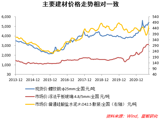 地产和基建两个大行业构成了建材行业的几乎所有下游需求。对于这三个技术环节不尽相同的主要建材行业,其价格的长期走势大致一致,也很大程度上反映了建材领域的共同决定因素是更加宏观层面的经济运行形势和地产基建需求。