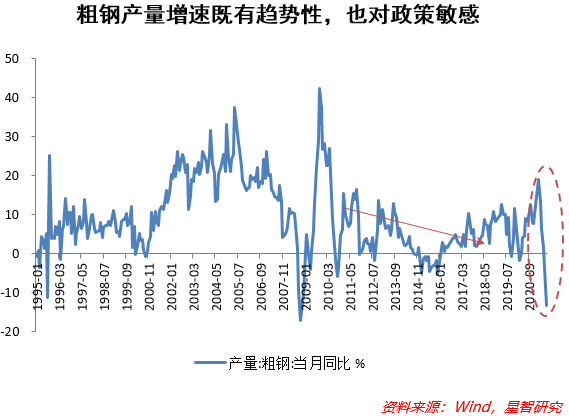 作为涉及能源的国民经济重要行业构成,产业政策对建材行业的影响不可忽视。去产能、淘汰过剩产能、技术升级补助等政策都对行业供给和竞争产生根本性影响。以钢铁产业为例(水泥、玻璃产业类似),2015年底去产能加码后,钢铁产能扩张受限,产量增长也受到较大压制。更为典型的例子是,2020年以来对钢铁产量的限制加大,政策刚性变大,钢铁产量回落速度超乎想象。
