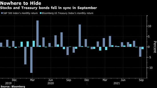 摩根大通分析师认为,持续的通货膨胀可能引发债券和股票同步下跌,从而让那些使用固定收益证券来保护投资组合免受股市下跌影响的投资者倍感头痛。9月份债券市场的抛售与标普500指数下跌4.8%同时发生,多重资产投资者遭受重创。这种痛苦可能还没有结束。包括Nikolaos Panigirtzoglou在内的摩根大通策略师指出,随着供应瓶颈和大宗商品价格持续上涨,通胀意外可能会持续到2022年。
