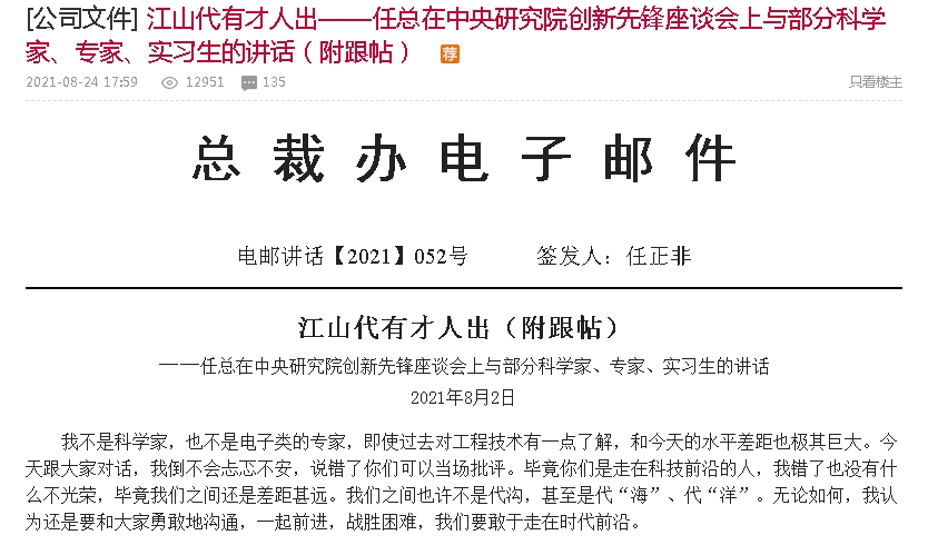 近日,华为心声社区公开了任正非在华为中央研究院创新先锋座谈会上与部分科学家、专家、实习生的讲话。