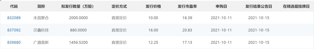 据全国股转网站显示,禾昌聚合(832089)、汉鑫科技(837092)、广道高新(839680)3家公司将于10月11日精选层打新。