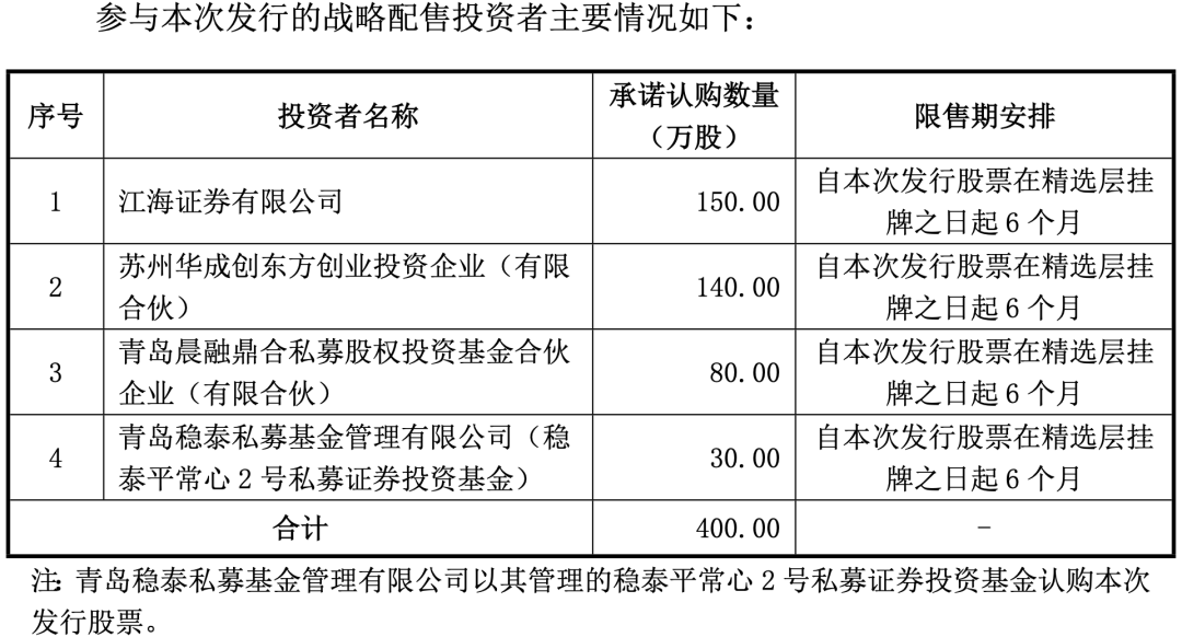 禾昌聚合此次吸引来4家战投认购400万股,分别是苏州华成创东方创业投资企业(140万股)、江海证券有限公司(150万股)、青岛晨融鼎合私募股权投资基金合伙企业(晨鸣资管)(80万股)、青岛稳泰私募基金管理有限公司(30万股)。
