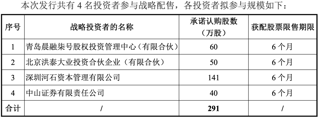 广道高新此次吸引来4家投资者,战投认购291万股。分别是青岛晨融柒号股权投资管理中心(晨鸣资管)(60万股)、北京洪泰大业投资合伙企业(50万股)、深圳河石资本管理有限公司(141万股)、中山证券有限责任公司(40万股)。