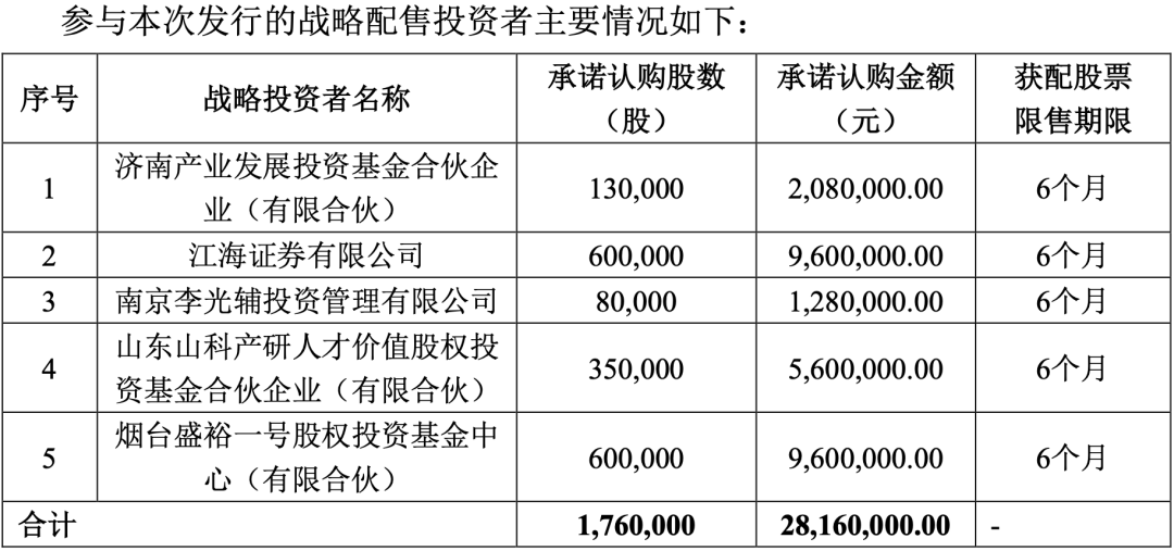 汉鑫科技此次吸引来5家投资者,战投认购176万股。分别是济南产业发展投资基金合伙企业(13万股)、江海证券有限公司(60万股)、南京李光辅投资管理有限公司(8万股)、山东山科产研人才价值股权投资基金合伙企业(35万股)、烟台盛裕一号股权投资基金中心(60万股)。