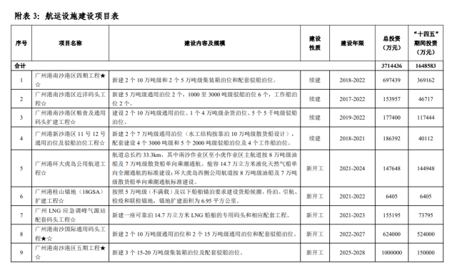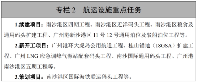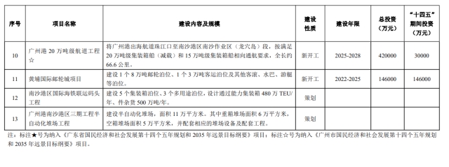 南沙港区五期工程、南沙港区国际通用码头工程的用地、围填海等前期工作将在“十四五”期间推进。为了提高公共航道与锚地适应能力的环大虎岛公用航道工程和桂山锚地扩建工程也将开工建设。广州港20万吨级航道工程等前期工作也将启动。