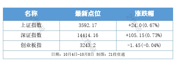 10月8日,国庆节后首个交易日三大指数集体高开后震荡走低,截至收盘涨跌不一。其中沪指涨0.67%,深证成指涨0.73%,创业板指跌0.04%。两市成交额继续保持万亿以上。
