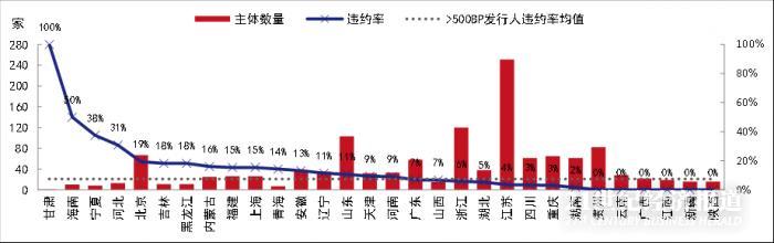 我们再来看一下高收益债发行主体在各地区的分布和违约特征。从绝对数量来看(图3),江苏是高收益债主体的绝对大省,主体数量高达521家,是第二名的两倍之多,占整体高收益债主体的16.4%;其次是浙江和山东,均在200家以上。在利差>400BP(图5)、>500BP(图6)、>600BP(图7)三组高收益主体中,江苏、浙江、山东均是排名前三。重庆以140家跃居第七名,其它网红地区如贵州、云南、天津则分别以135家、91家、78家分居第八、十三、十六位。