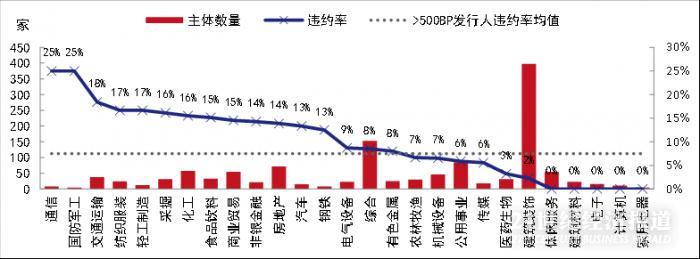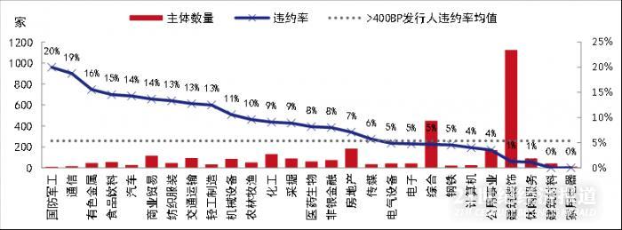 行业分布和违约特征方面,从统计数据来看,建筑装饰是高收益主体数量最多的行业,仅其一个行业就占全部高收益主体的35%;其次是综合、房地产、公用事业,也是一级市场高收益债发行主体的主要分布行业(图8)。前四个行业占全部高收益主体的60%。但建筑装饰、综合行业的高收益主体中有较大比例为城投,也就是说有相当数量的弱资质城投其发行利差还是偏高的。