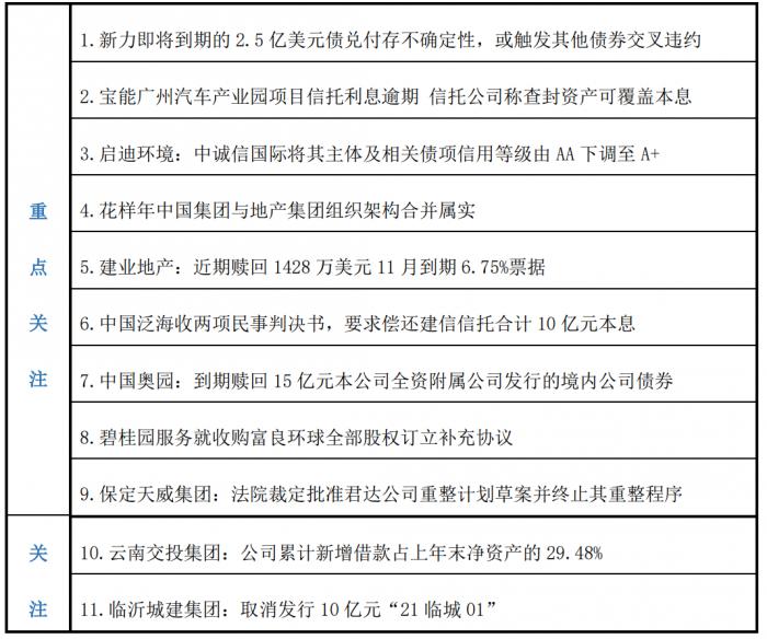 21世纪资管研究院研究员 赵阳 地产风险持续发酵,新力控股即将到期的2.5亿美元债兑付存不确定性,或触发其他债券交叉违约;建业地产近期赎回1428万美元11月到期6.75%票据;中国泛海收两项民事判决书,要求偿还建信信托合计10亿元本息;中国奥园到期赎回15亿元本公司全资附属公司发行的境内公司债券。