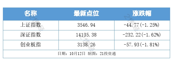 10月12日,A股三大指数收跌,上证指数跌1.25%,深证成指跌1.62%,创业板指跌1.81%。两市超3600只个股飘绿,成交额连续2天不足万亿元。