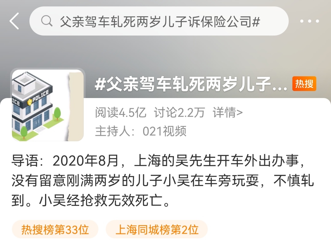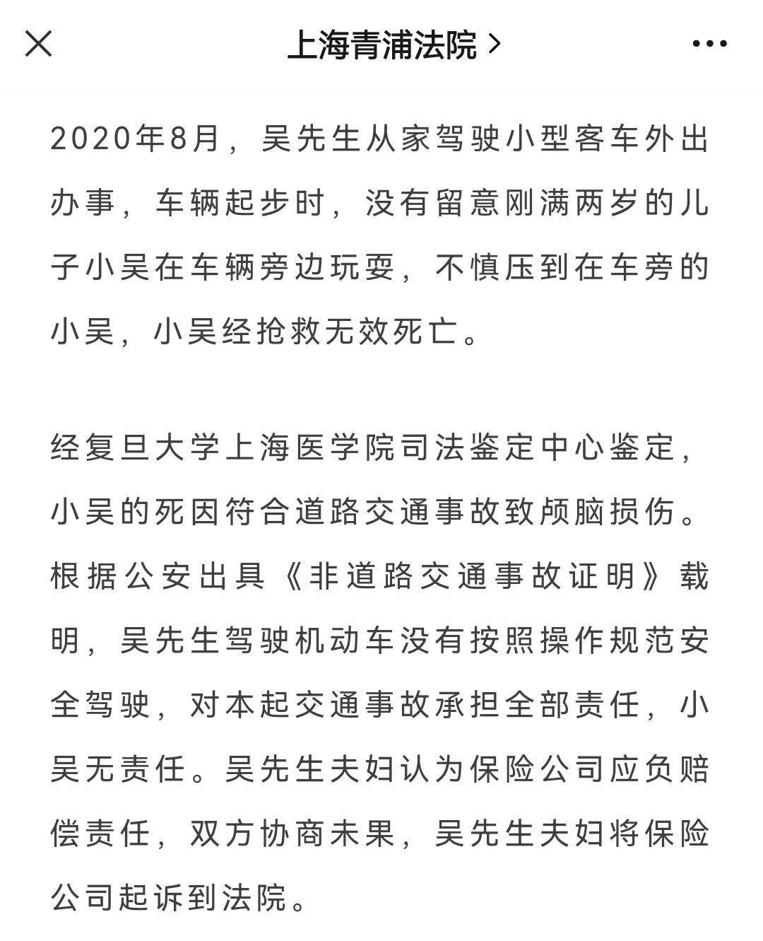 近日,一起机动车交通事故责任纠纷在网络上引发热议。上海的吴先生从家驾驶小型客车外出办事,车辆起步时,没有留意刚满两岁的儿子小吴在车辆旁边玩耍,不慎轧倒小吴,结果经抢救无效死亡。事后,吴先生夫妇选择起诉保险公司,并最终获赔百万余元。