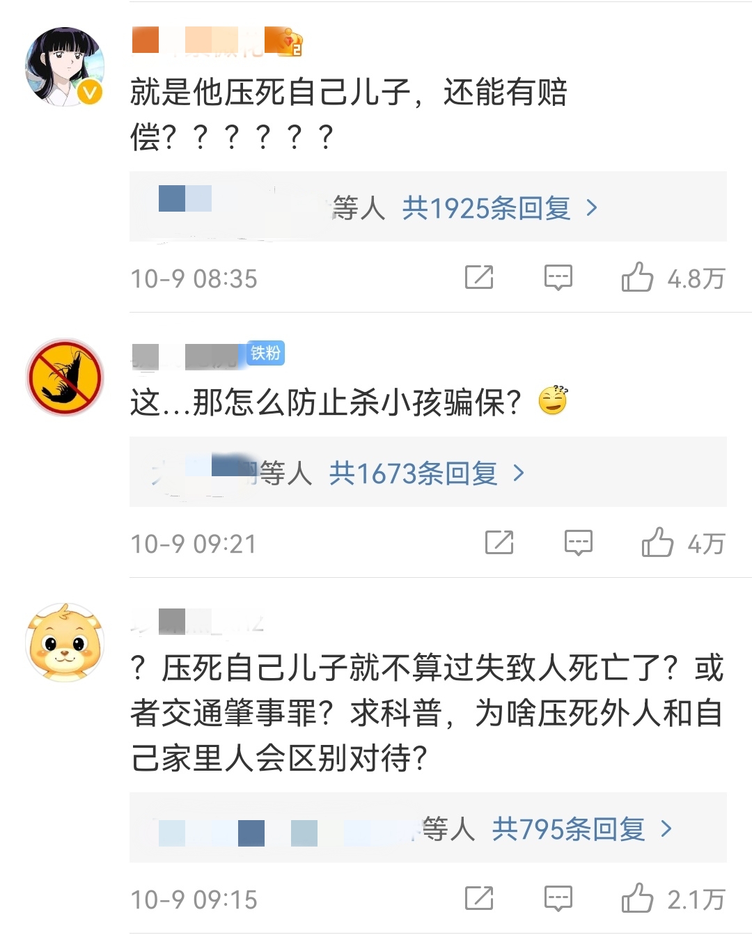 该判决一经公布,旋即登上微博热搜。不少网友对于肇事者索赔成功表示不理解,担心今后有人会借此案例恶意骗保。也有网友认为,骗保还是意外应该由警方定夺,保险公司该赔的钱不应该受到父子关系的影响。
