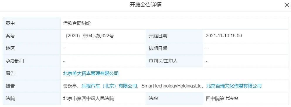 上海证券报记者今日获悉,北京英大资本管理有限公司(下称“英大资本”)与乐视汽车、贾跃亭等被告方的借款合同纠纷案将于11月10日开庭。