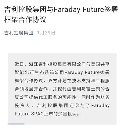 根据公司S-4上市文件披露,法拉第未来与吉利控股曾在2020年12月签订不具约束力的谅解备忘录。双方将在技术、供应链和合同制造等各个领域开展战略合作。此后,双方与2021年1月进一步在成立合资公司方面达成了框架协议。另据上市文件披露,富士康也是法拉第未来合作的潜在对象之一。