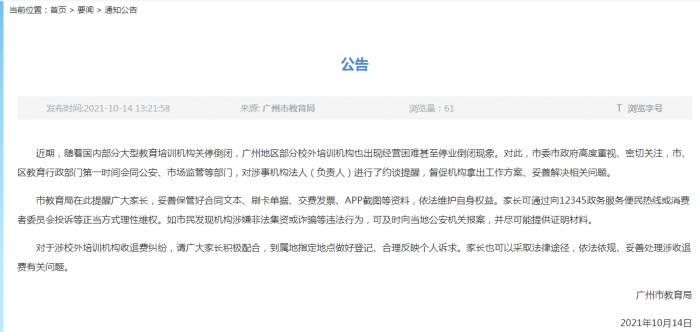 近期,随着国内部分大型教育培训机构关停倒闭,广州地区部分校外培训机构也出现经营困难甚至停业倒闭现象。对此,市委市政府高度重视、密切关注,市、区教育行政部门第一时间会同公安、市场监管等部门,对涉事机构法人(负责人)进行了约谈提醒,督促机构拿出工作方案、妥善解决相关问题。
