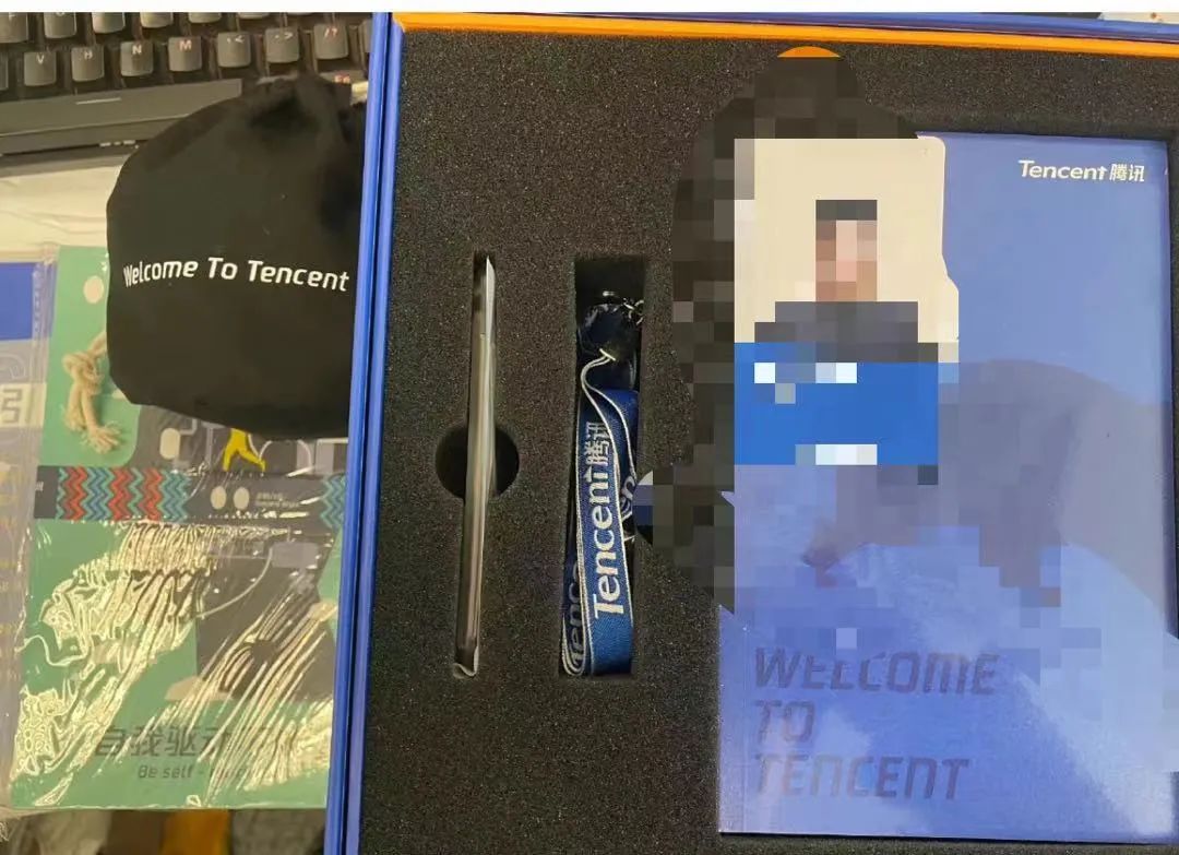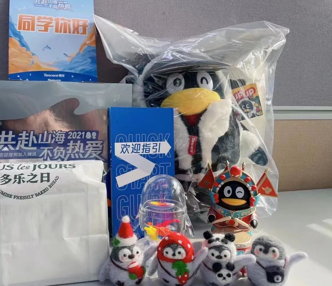 里面有新工卡、牛气冲天企鹅公仔、员工入职手册、一套笔记本,还有几个玩偶摆件。