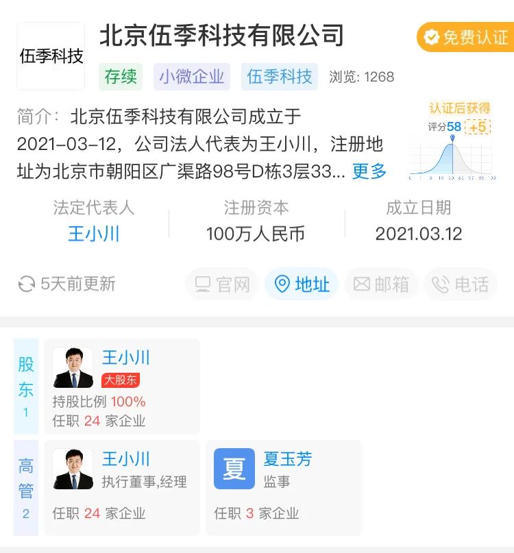 7月26日,北京五季健康咨询有限公司成立,法定代表人为王小川,持股99%。经营范围含健康咨询(不含诊疗服务);计算机系统服务;应用软件服务;软件开发等。
