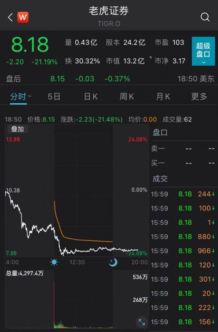 美东时间周四,美股全线上涨,中概券商股逆市大幅下挫,老虎证券跌超21%,富途控股跌逾12%,两者蒸发市值总计折合人民币超过110亿元。最新市值显示,富途总市值约107亿美元,老虎总市值约13亿美元。