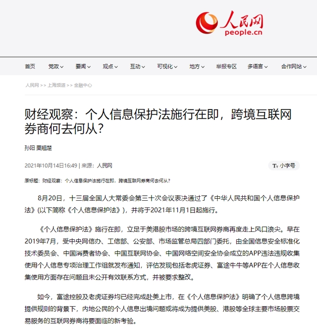 人民网在报道中表示,富途控股及老虎证券均已在美上市,在《个人信息保护法》明确了个人信息跨境提供规则的背景下,内地公民的个人信息出境问题或将成为提供美股、港股等全球主要市场股票交易服务的互联网券商将要面临的新考验。
