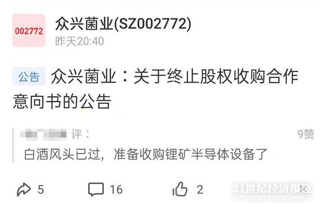 (图说:网友评价众兴菌业终止收购,图片来源:网络投资社区,记者截图)
