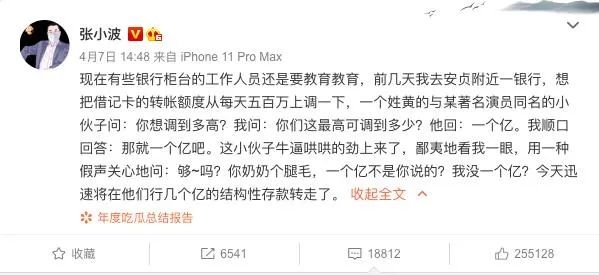 2020年4月7日,国内知名书商、凤凰联动董事长@张小波也曾在微博上吐槽说,他去一家银行想上调借记卡每天500万的转账额度,柜员对他流露出鄙夷的态度,于是一怒之下他将在这家银行的几亿元结构性存款转走。