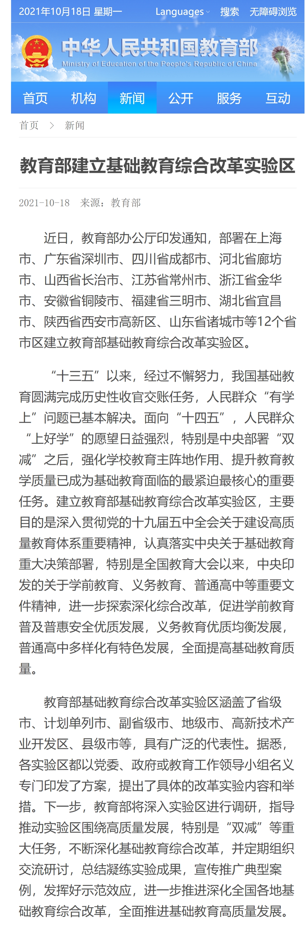 教育部就“建立基础教育综合改革实验区”进行权威发布