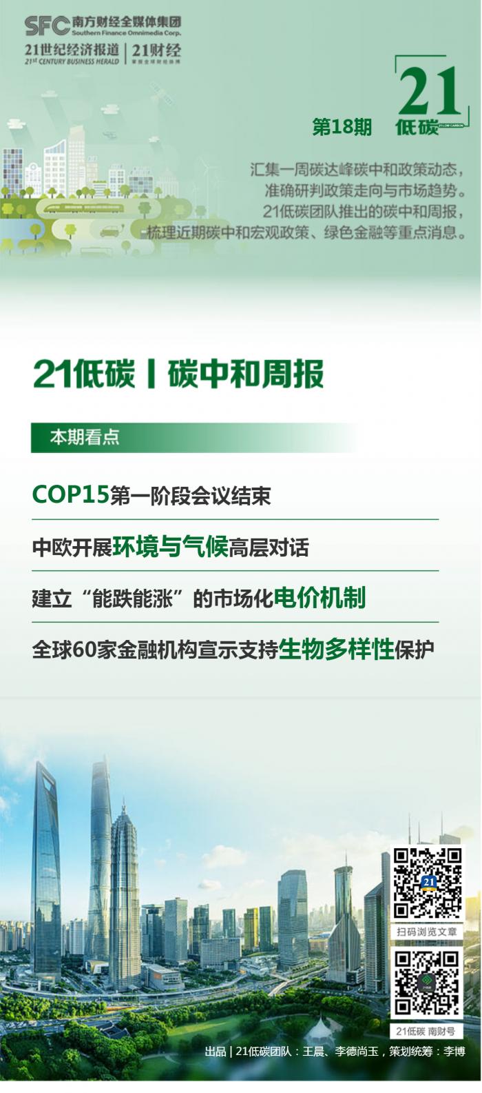 本期看点:COP15第一阶段会议结束,三大重要成果推动全球行动;中欧开展环境与气候高层对话,将在煤炭转型、碳市场等领域开展合作;发改委:有序放开全部燃煤发电电量上网电价,建立“能跌能涨”的市场化电价机制;全球60家银行业金融机构在COP15共同宣示支持生物多样性保护。