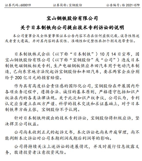 10月18日,宝钢股份公告,日本制铁10月14日宣布,因公司违反日本制铁电磁钢板相关专利,生产电磁钢板供应丰田汽车用于电动汽车制造,已向东京地方法院起诉宝钢股份和丰田汽车,要求两家企业分别给予200亿日元的损害赔偿。针对日本制铁所提出的技术专利诉讼,宝钢股份将积极应诉,坚决捍卫公司权益。公司尚未收到正式的起诉文书,本次诉讼也尚未开庭审理,尚不能判断本次诉讼对公司本期利润或期后利润等的影响。