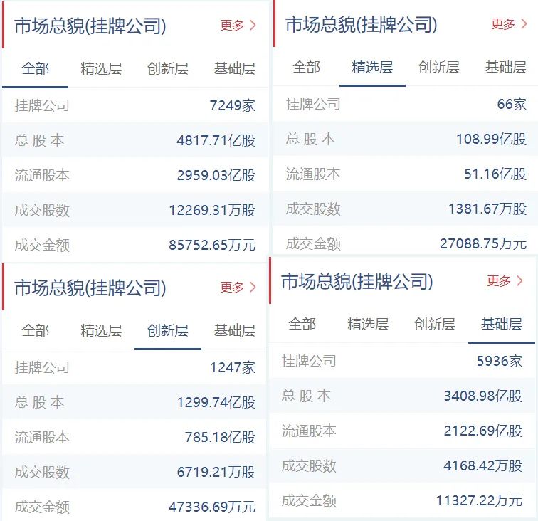 新三板挂牌公司总计7249家(精选层66家,创新层1247家,基础层5936家),总股本4817.71亿股,流通股本2959.03亿股。
