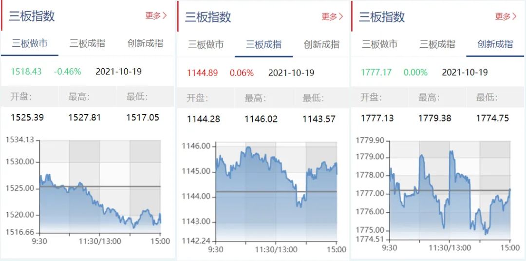 截至10月19日收盘,三板做市报1518.43点,下跌0.46%;三板成指报1144.89点,上涨0.06%;三板创新报1777.17点,下跌0.00%。